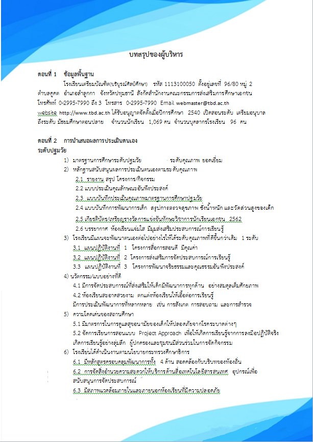 สรุปข้อมูลการรายงานประเมินตนเอง (SAR) ปีการศึกษา 2562 by TBD School · Published 29 กรกฎาคม 2020 · Updated 5 กรกฎาคม 2021 รายงานผลการประเมินตนเองของสถานศึกษา (SAR) ประจำปีการศึกษา 2562 ฉบับเผยแพร่ บทสรุปผู้บริหาร